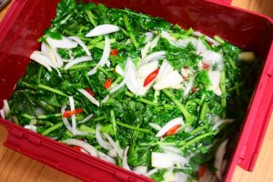 김치 담을 용기는 깨끗하게 소독한 뒤 사용하세요. 김치 전용 용기가 가장 좋지만, 깨끗한 밀폐용기나 유리병도 무방합니다. 용기 바닥부터 열무를 층층이 쌓아 올리고, 마지막에는 위쪽에 남는 공간이 없도록 눌러 담습니다. 양념이 흘러내리지 않도록 조심하면서 평평하게 정리해 주세요.