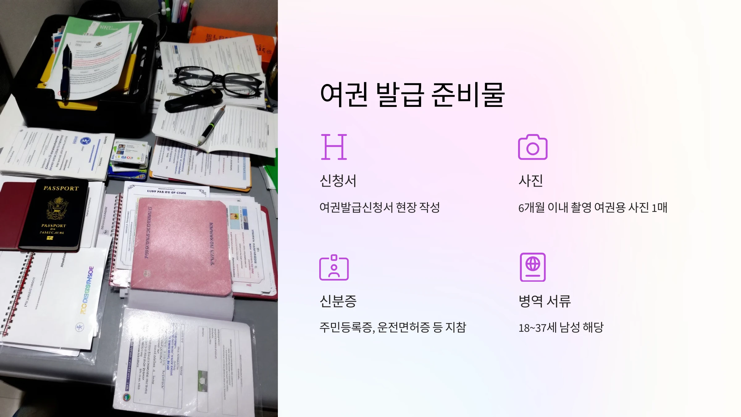 - 여권용 사진 1매: 최근 6개월 이내 촬영한 규격 사진을 준비하세요.