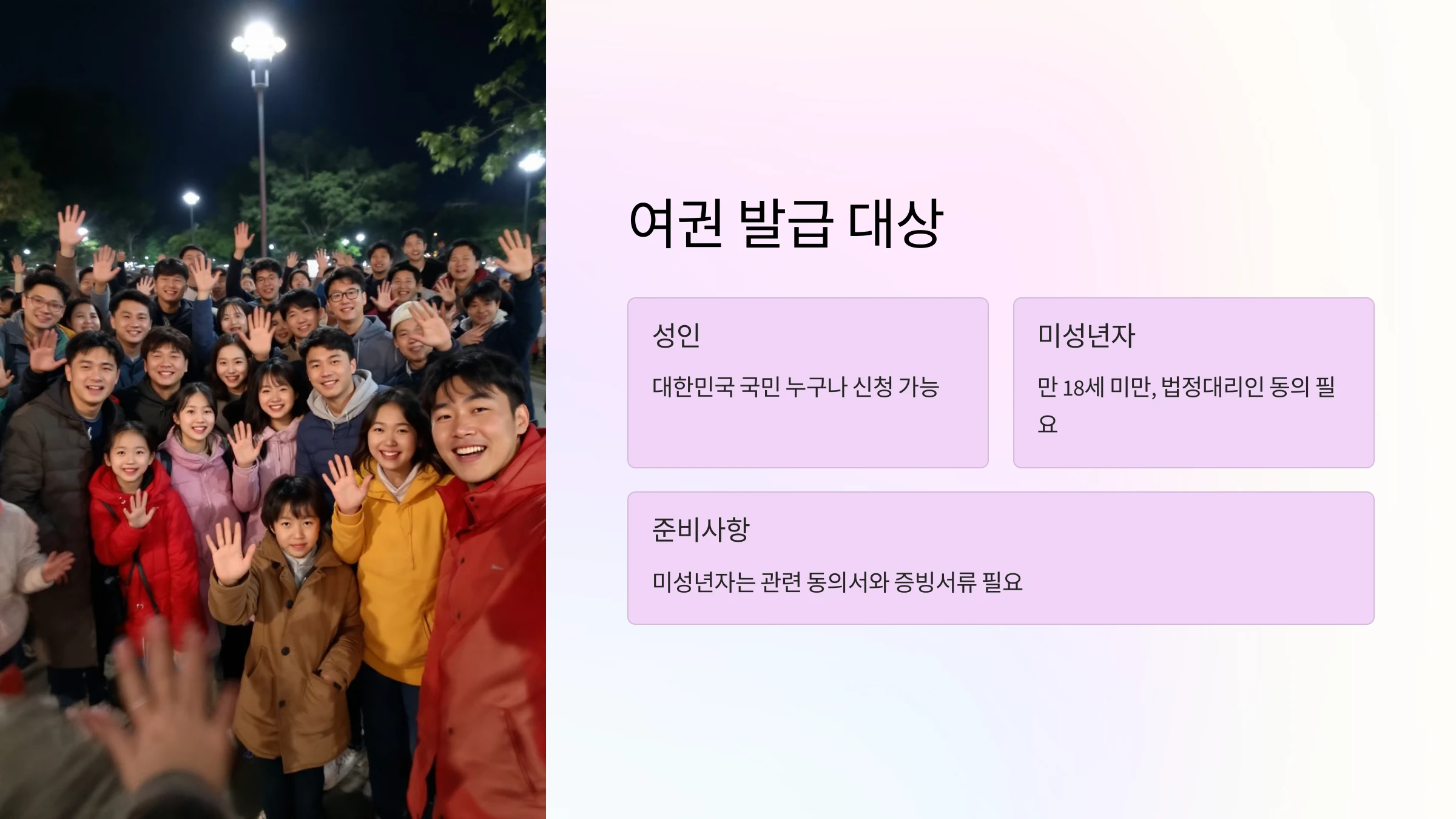 대한민국 국민이라면 기본적으로 여권을 발급받을 수 있습니다. 다만 만 18세 미만의 미성년자는 법정대리인의 동의가 필요하고, 그에 따른 추가 서류를 준비해야 합니다. 성인은 별도의 동의 없이 신청할 수 있으며, 미성년자의 경우 부모(또는 법정대리인) 동의서와 관련 증빙을 반드시 지참해야 합니다.